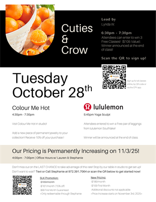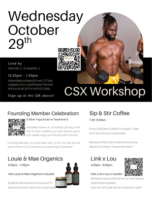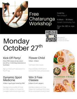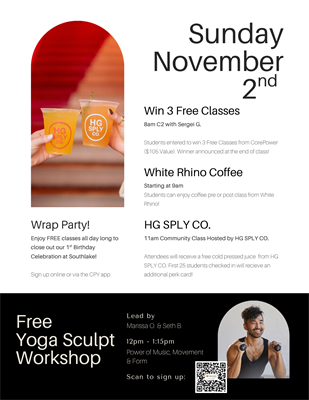 Name: CorePower Southlake 1 Year Anniversary!Date: October 27, 2025 - November 2, 2025Event Description:Come celebrate CorePower Southlake's 1st birthday during our weeklong celebration! Don't miss out on free classes, local vendors & the chance to win exclusive prizes!Location:1431 E Southlake Blvd, Southlake, TX 76092Date/Time Information:10/27/25 - 11/2/2025Contact Information:Stephanie Santos - 9723917064Fees/Admission:Free - claim a free week with us and attend any or all of our special classes!Set a Reminder: