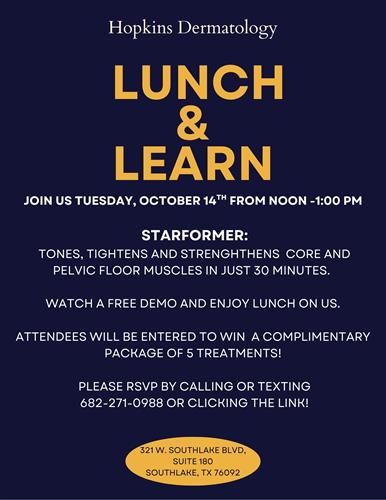 Join us for a free lunch on 10/14 at 12 noon to learn all about StarFormer! StarFormer is a cutting-edge treatment designed to help you tone, tighten, and strengthen core and pelvic floor muscles.